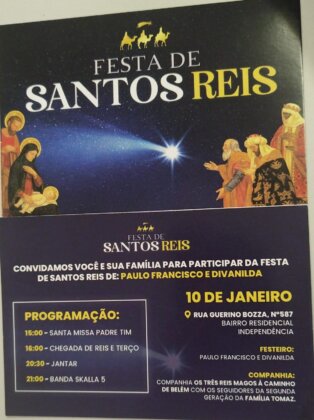 Organizada pelos festeiros Paulo Francisco e Divanilda, a festa também contou com a presença da companhia “Os Três Reis Magos à caminho de Belém”, formada por integrantes da segunda geração da Família Tomaz, que mantém viva a tradição local de encenar a passagem dos Reis Magos.