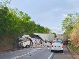 Engavetamento de caminhões, acidente grave na BR 153 ontem, causou morte em rodovia próximo a Frutal
